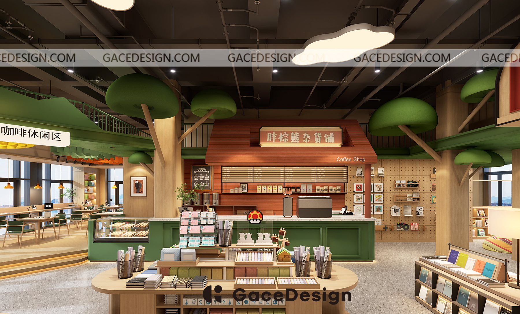 ? “笨狼家·林木森書店”坐落于湘江新區美麗的梅溪湖畔,是以笨狼媽媽湯素蘭童話作品為元素打造的兒童成長、休閑閱讀空間。 旁邊還有一條清澈的梅溪湖,周邊的自然風景很優美。設計師在設計上運用大面積落地玻璃,將內外景觀融合,讓自然與室內結合。