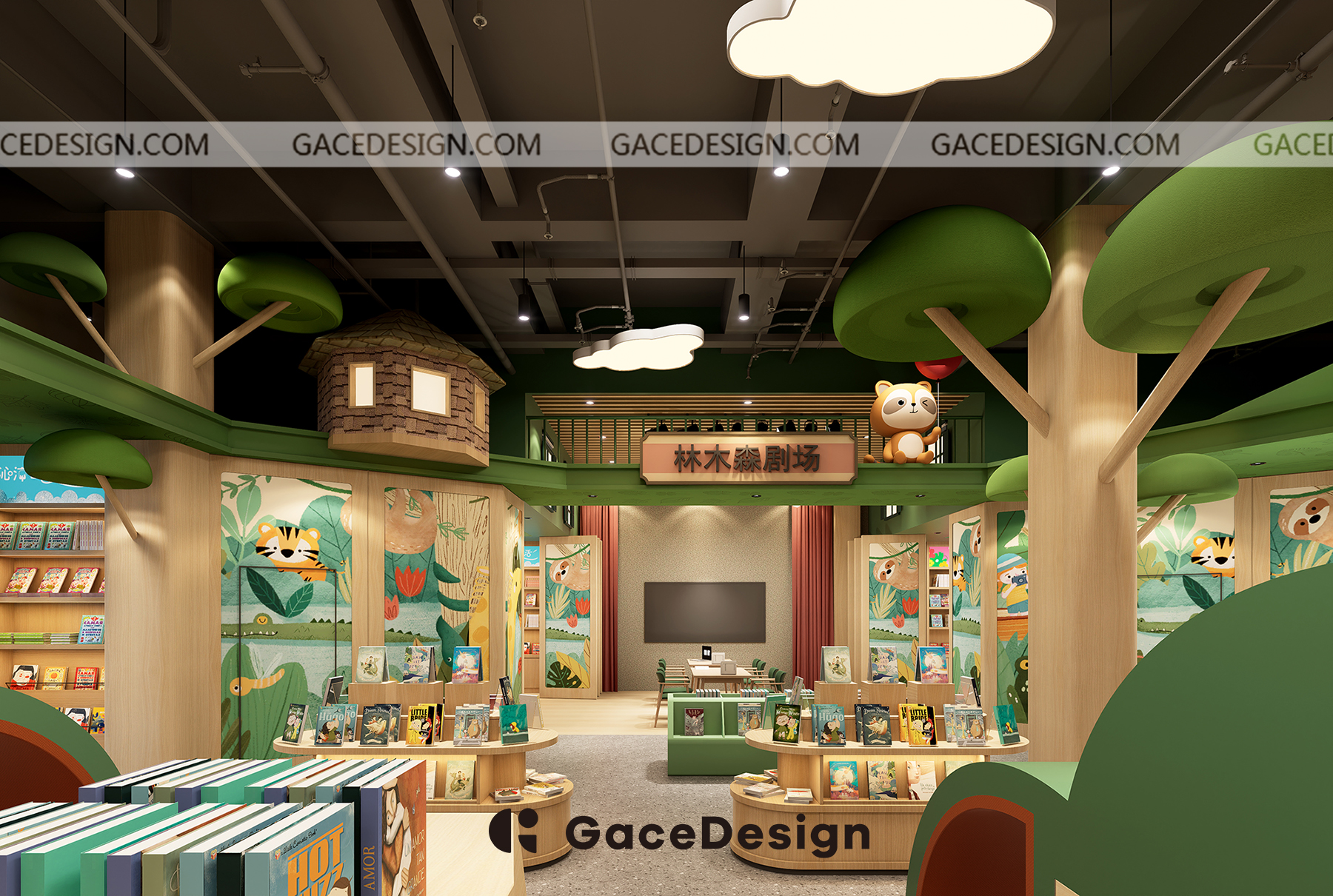 ?設計師希望給孩子更多類似森林的行走路徑,通過環境引發孩子自主尋找書的樂趣。以“室內建筑”為設計理念,鋪設綠色草坪,在室內開辟一處獨特的“森林仙蹤”場地,設計手法突出項目層高的優勢。功能區猶如散落在森林的獨棟小屋,樓上樓下,院內院外,皆是孩子的專屬天地。