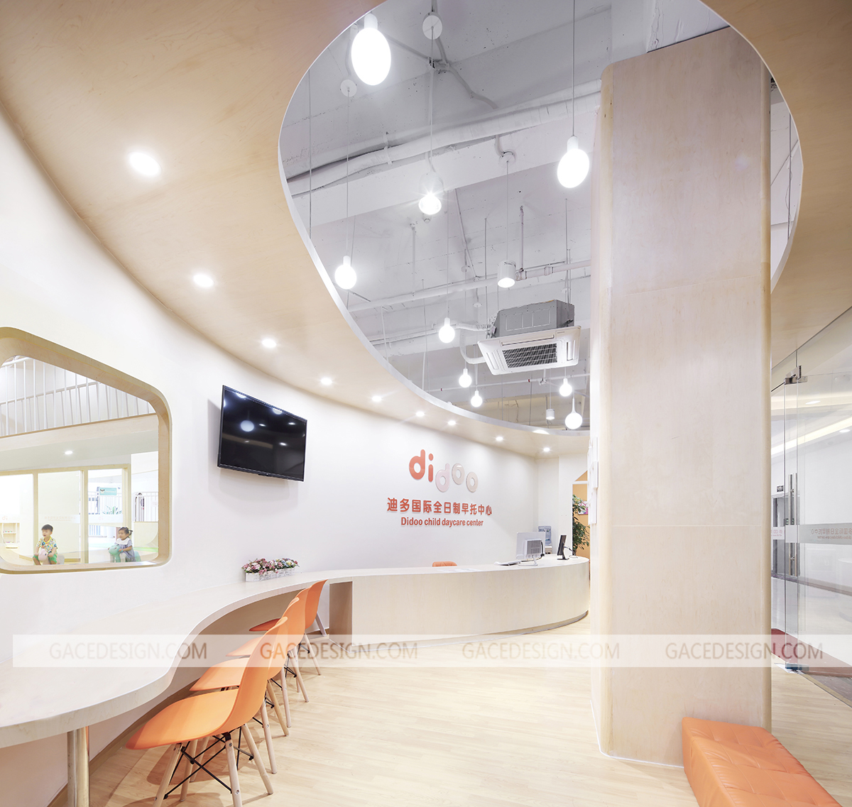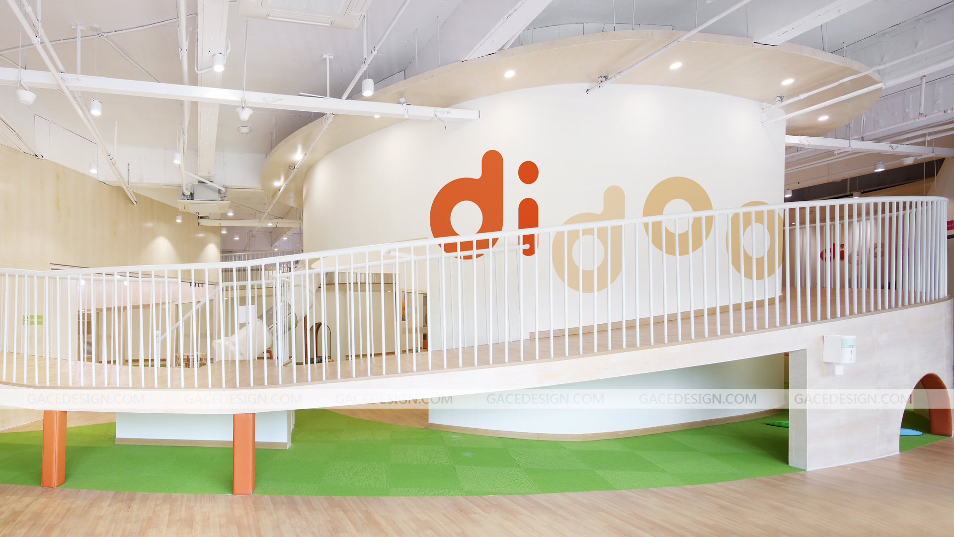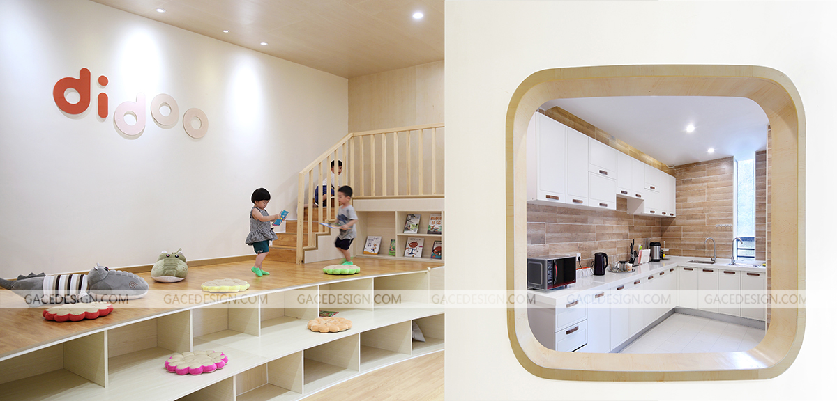 迪多國際全日制早托中心,為新時代父母提供安全,科學,全面的幼兒全日制托管服務,致力于培養2-6歲兒童優秀的行為習慣、獨立人格及社交能力。作為全日制日托中心,是兒童的另一個家,這是一個謀求大尺度變化的空間設計,規避程式化的隔班教學,將自然元素引入,打造全新的敘事空間。營造簡潔自由的空間,干凈的木色地板和青翠的草甸鋪陳開來,Didoo的橙色點綴其中,自然系配色去嘈雜化令空間更親和。