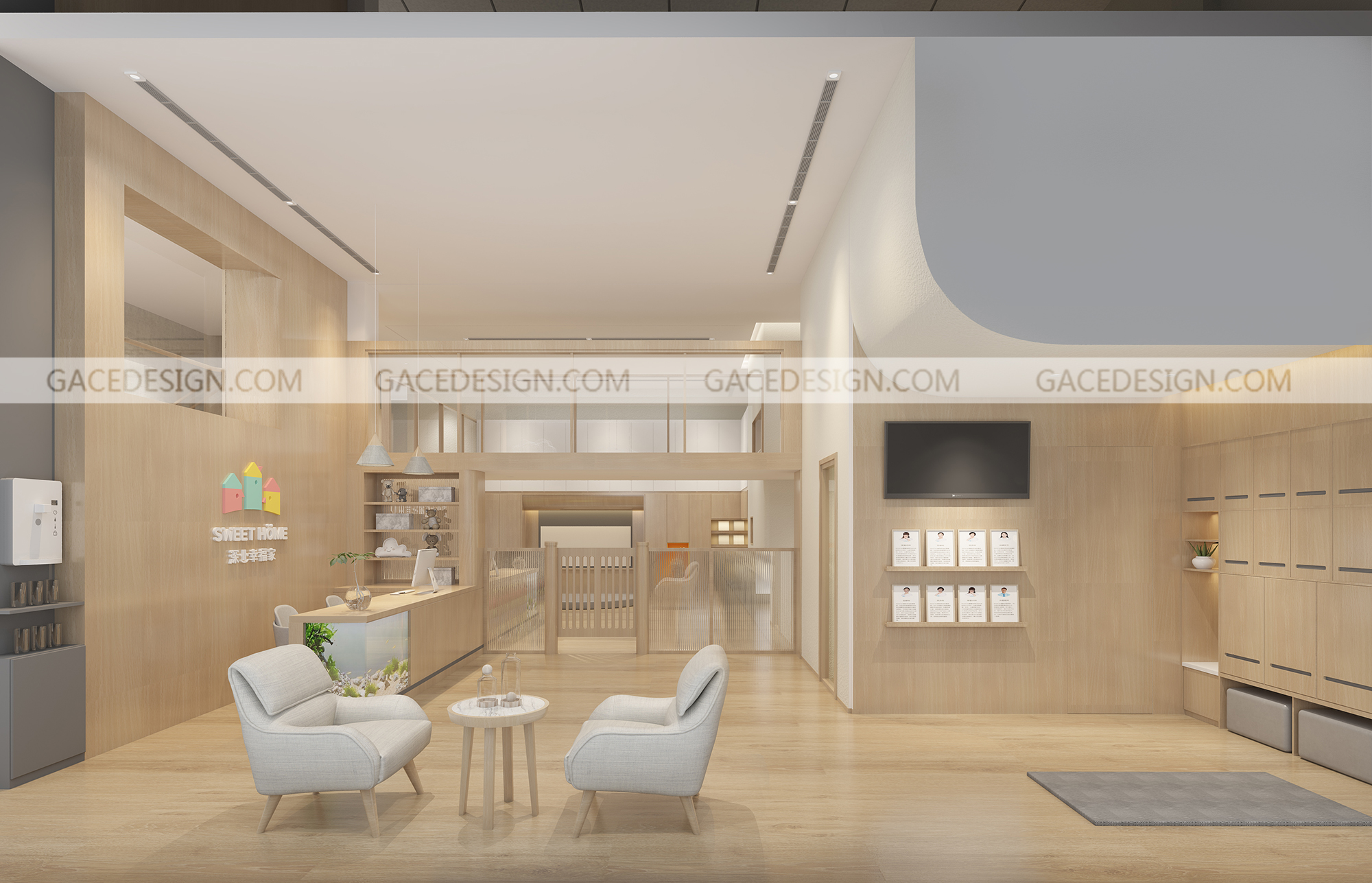 從前廳入口,我們?cè)O(shè)置了一個(gè)門(mén)廳,孩子就像回家一樣,在門(mén)廳處就完成了換鞋和洗手的功能,孩子有專(zhuān)屬的換鞋凳和鞋柜。空間造型上我們進(jìn)行了簡(jiǎn)化,保留了原有的層高,讓陽(yáng)光最大程度的映入空間。在前臺(tái)處我們還設(shè)置了孩子尺度可觀賞的魚(yú)缸。在空間基調(diào)上我們選擇了柔和木質(zhì)材料與自然光線的映射,使空間呈現(xiàn)明快輕松的氛圍。為了讓孩子自己與環(huán)境互動(dòng),我們?cè)谝粚釉O(shè)置了一個(gè)空曠的空間,孩子們能夠在這里安全的爬行和玩耍,我們根據(jù)不同年齡段孩子的需求還設(shè)置了不同的區(qū)角,益智區(qū)、繪本角、涂鴉墻和感統(tǒng)區(qū)等等。在樓梯閣樓中我們加入了更多可互動(dòng)性的功能。通過(guò)墻上的樂(lè)高墻壁,區(qū)域角的閱讀小書(shū)屋,攀爬區(qū),滑梯,涂鴉墻。除此之外教室設(shè)計(jì)應(yīng)充分的考慮孩子們的尺度和保育員的保育便捷和操作性。我們?cè)陧?xiàng)目中嘗試探討空間與兒童的探索關(guān)系。努力營(yíng)造一種孩子可以自己發(fā)育成長(zhǎng)的環(huán)境模式。