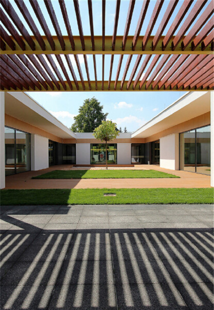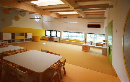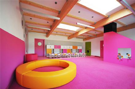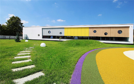 Yellow Elephant幼兒園位于波蘭Ostrow Mazowiecka,單層天井式的建筑結(jié)構(gòu),屋頂采用膠合木板打造,共有5間,可招收125名兒童。內(nèi)部的庭院打造沙坑、樹(shù)木及草地等,這里也是幼兒園的中心區(qū)域。面向庭院的立面安裝大型落地玻璃窗,內(nèi)部既可以獲得充足的光線,也能欣賞到庭院的景色。幼兒園設(shè)計(jì)
