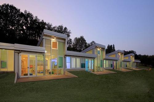 寬大的玻璃窗系統(tǒng)在一天中的不同時(shí)候都可以對(duì)太陽光線進(jìn)行過濾,以保持住室內(nèi)的熱量。其它的熱源通過兩個(gè)不同的設(shè)備來獲得:放置在防水壁裝置中的地?zé)崽筋^和位于地面和熱泵間的熱交換設(shè)備。光電池辦被安裝在屋頂隔間中。雨水被收集進(jìn)特別的水槽之中,用于灌溉和沖洗浴室。顏色,材料和特別的設(shè)計(jì)形狀體現(xiàn)出了所有可持續(xù)性的系統(tǒng),它們同時(shí)也體現(xiàn)出了整個(gè)建筑的現(xiàn)代感。