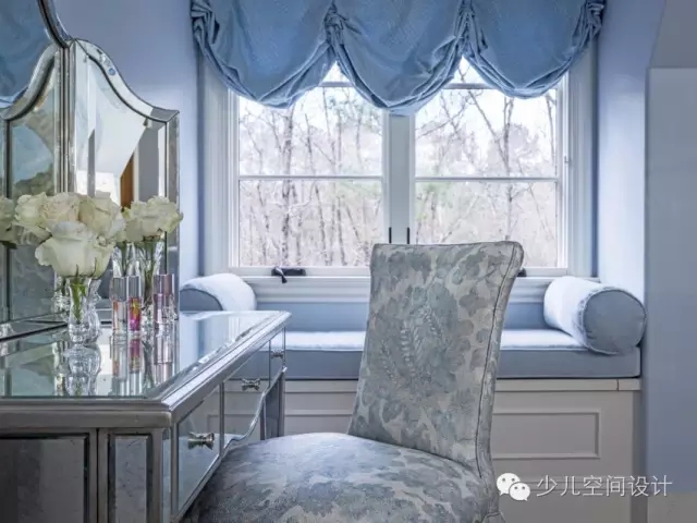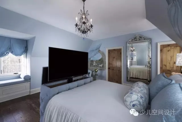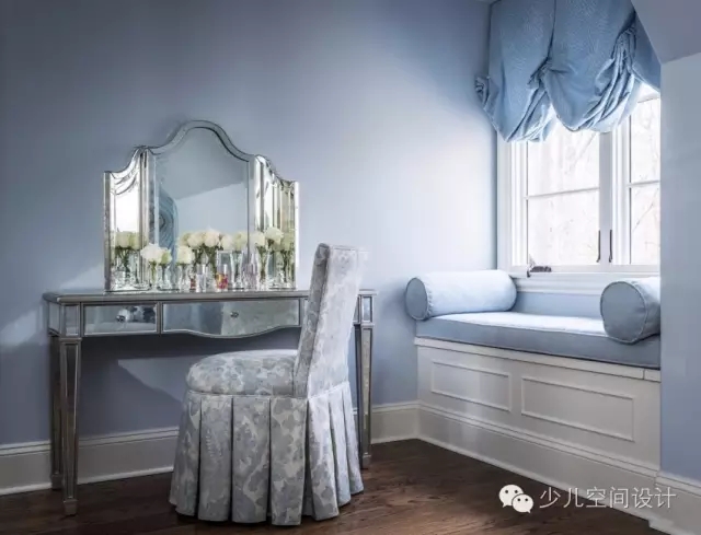 柔和的板藍(lán)色和銀色用來(lái)打造像公主一樣的宮殿。設(shè)計(jì)師給她設(shè)計(jì)一個(gè)特別舒適的窗口角落,也方便閱讀。從流動(dòng)的瀑布式窗口處理的啟示進(jìn)行概念設(shè)計(jì)的手繪壁畫(huà)。在床上,還定制了床罩和枕頭等匹配裝飾的家居用品。