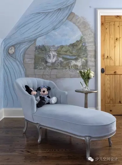 設(shè)計(jì)的壁畫(huà),這與童話(huà)的主題,品味相輔相成,時(shí)尚典雅,讓人產(chǎn)生幻想的空間,從而解決了房間里面天花板和墻壁的問(wèn)題。