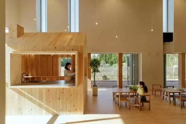 大量色彩自然柔和的木質板材,并配有大面積的窗戶。自然光線與嵌入天花板的長條燈管,一同烘托出明亮的室內環境。室外中部的庭院,則是孩子們親近自然的理想場所。在室外庭院的設計中保留了原先的老樹,下課后,小朋友可以在大樹底下玩耍,讓孩子們擁抱自然。
