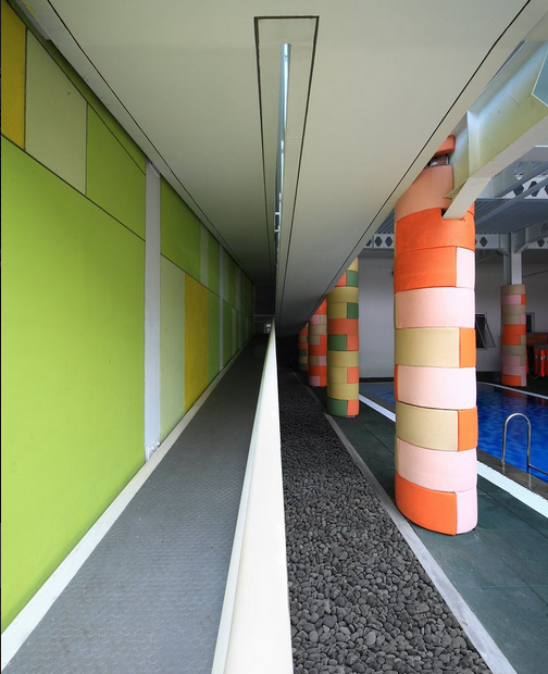 這個建筑的設計處處為孩子們的安全著想。園長的辦公室專門設置在一樓,臨近操場和游泳池,這樣可以方便園長監(jiān)控孩子們活動時的安全。操場的地面采用了1.5厘米厚的橡膠材質(zhì)做地板,游泳池被欄桿圍了起來,以防止孩子們發(fā)生安全事故。(幼兒園室內(nèi)設計)