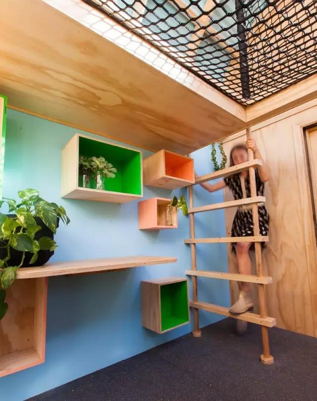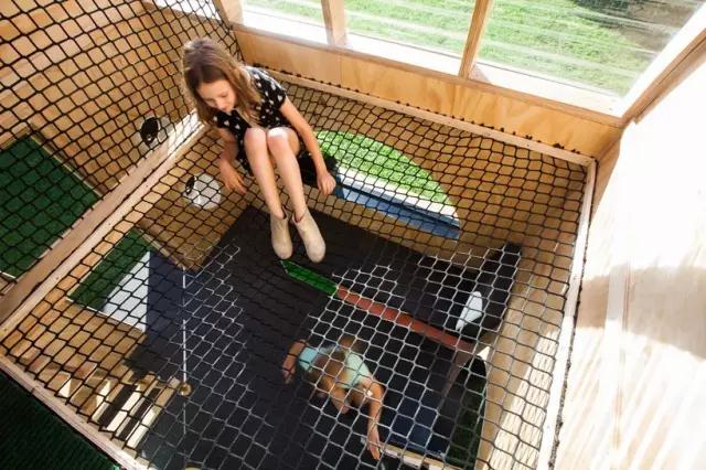 小木屋的頂部使用的是彎曲透明的屋頂,可以使得陽光能夠直接的照射到室內(nèi),還有就是屋內(nèi)設(shè)置了一個很有趣味性的功能網(wǎng),通過室內(nèi)的小木梯可以上到屋頂下的掛網(wǎng)上玩耍是一個非常不錯的體驗。