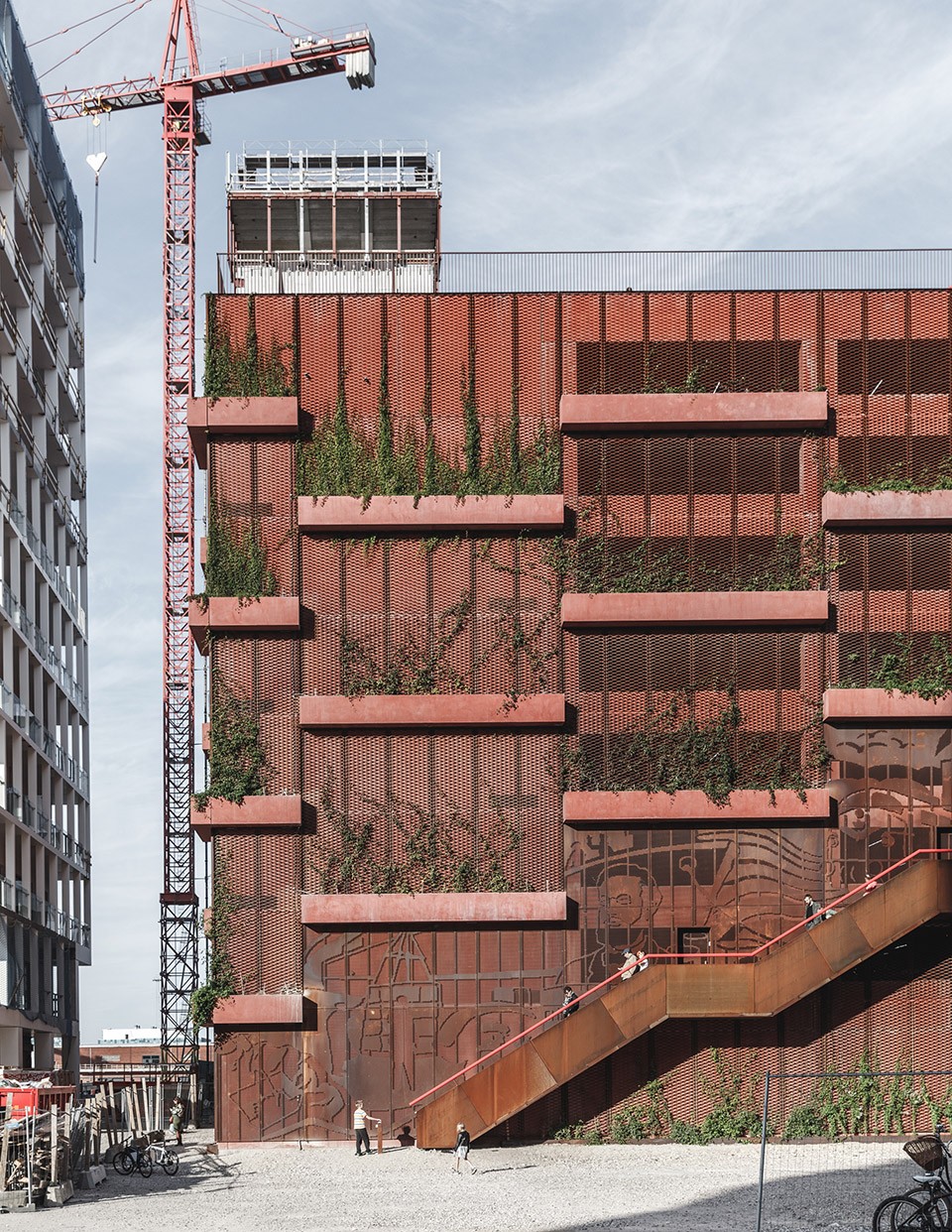 設(shè)計(jì)師沒(méi)有遮掩而是希望以暴力的結(jié)構(gòu)打破立面,樓層的外部掛著一系列的種植槽,和建筑的結(jié)構(gòu)相呼應(yīng),在給人們創(chuàng)造適宜的空間的同時(shí)也把綠色帶到了每個(gè)角落,兩條巨型樓梯穿插其中,樓梯之上采用鋼制扶手防護(hù)延綿而上,而轉(zhuǎn)到屋頂之后則是轉(zhuǎn)化為秋千、攀爬架、單杠等等面向各個(gè)年齡階層的運(yùn)動(dòng)游樂(lè)設(shè)施,創(chuàng)造出一個(gè)活力十足的公共空間。