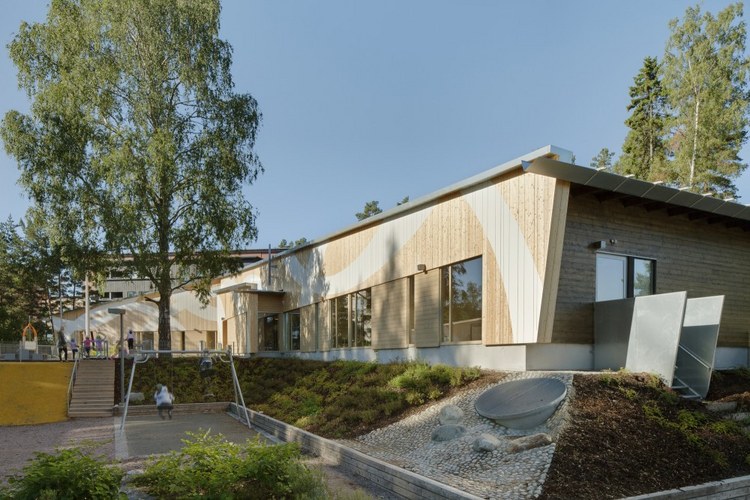 Omenapuisto日托中心位于芬蘭赫爾辛基,整個建筑主要的由單層體量構成,兩層高的部分是一個多功能的高挑空間,并且在這個空間設計有著一個通風裝置室和陽臺,整個建筑所在場地非常狹窄,項目的目標是打造輕盈開放的體量,屋頂吵兩個方向緩緩傾斜每一端都有一個大水槽將雨水排放到石頭鋪砌的水池中,并由此滲入地面,場地內水平高度的自然差異被用作坡道,與相鄰的道路形態相呼應。(幼兒園設計)