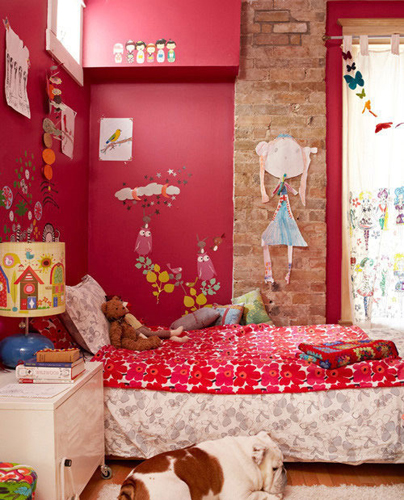 采用各種顏色的剪紙作為主題,以陳舊磚墻作為點綴,可以選擇玫瑰紅色的兒童房,這個風格給人的印象就是熱情奔放,而以陳舊的磚墻則是可以中和色調,能有效的保證孩子不會因為視覺上讓孩子的心情太過浮躁,而且在墻體上還可以貼一些可愛的墻貼,整個房間都從滿孩子喜好的元素,再配以艷麗的顏色會給予孩子很多的想象空間。(幼兒園設計