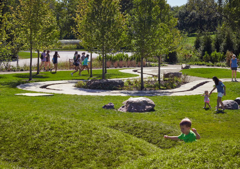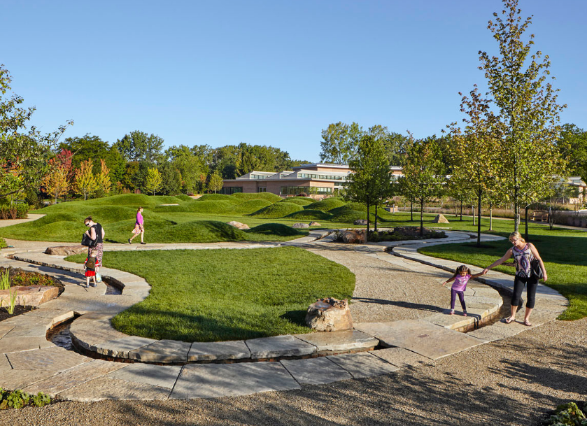 雷根斯坦學習園區是芝加哥植物園新設的環境探索中心和自然游樂場。這個占地六英畝的園藝園區作為科學園藝中心,為充滿活力的家庭社區服務,提供與自然環境的互動體驗,每年游客量超過12.5萬人。該設計促使家庭和各年齡段兒童參與豐富的戶外體驗,例如以探索為導向的學習和游戲,從而更深入了解生態系統。廣闊的花園提供各種自然體驗和探索活動,游客穿梭在草地、戲水小路、石塊、多樣的林地種植和柳枝隧道中。這個再生工程被設想為通向自然世界的門戶,一年四季提供探索與創造的機會。
