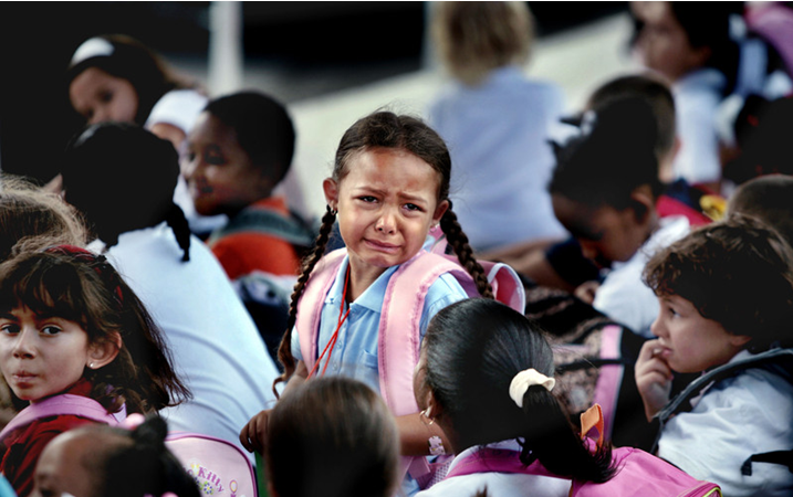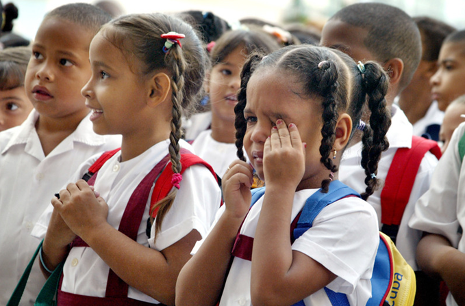 古巴哈瓦那,一個小女孩在開學第一天抹眼淚。